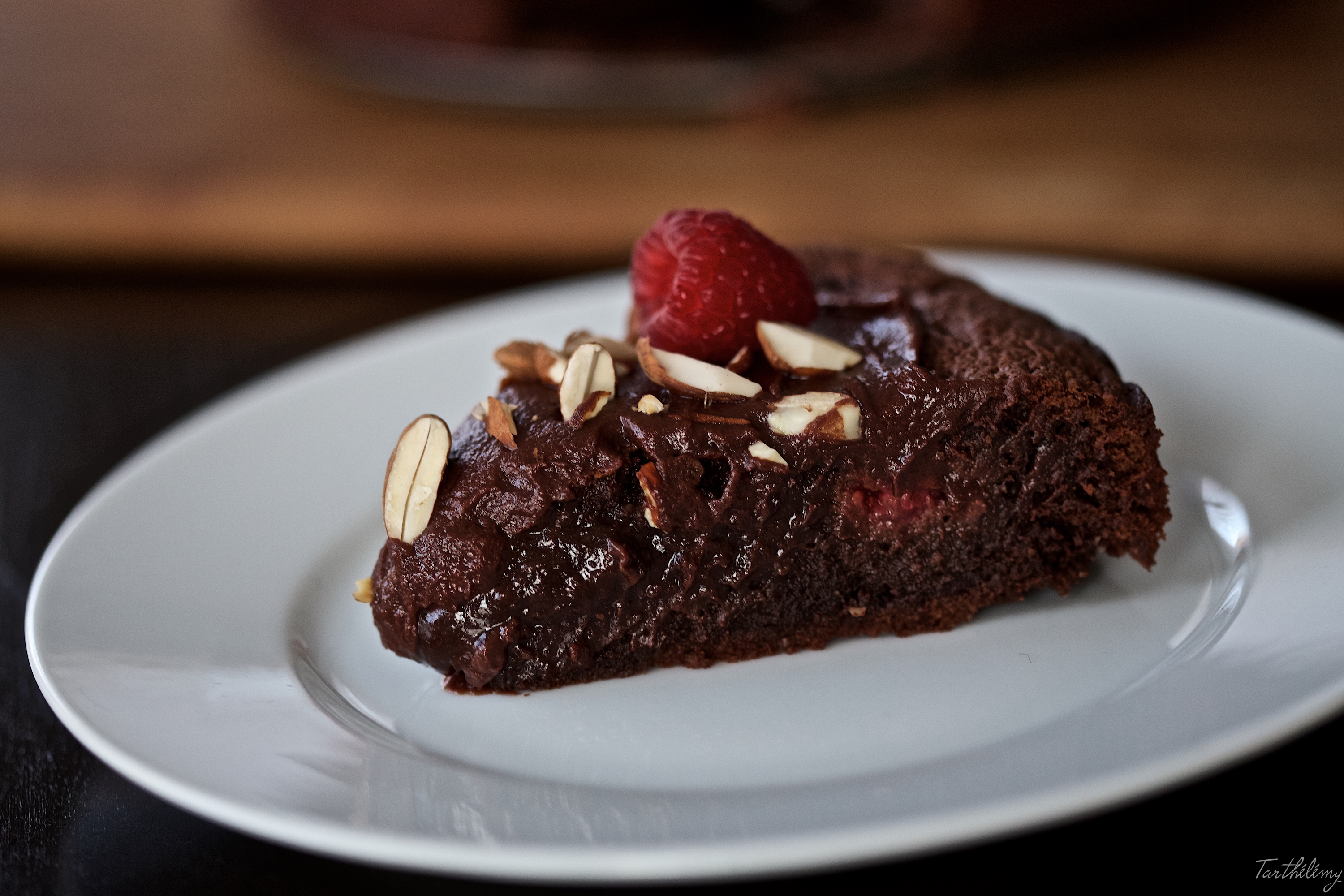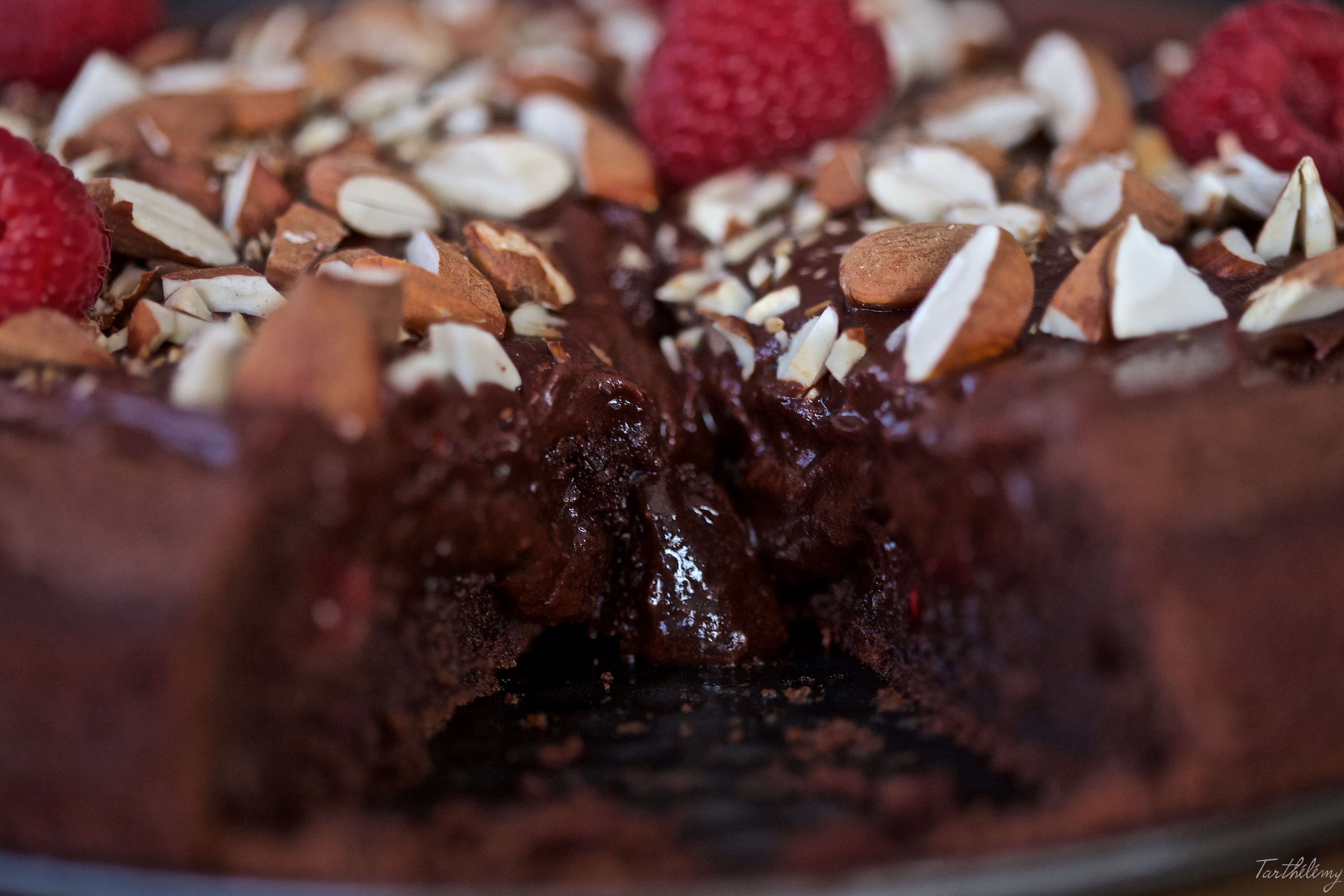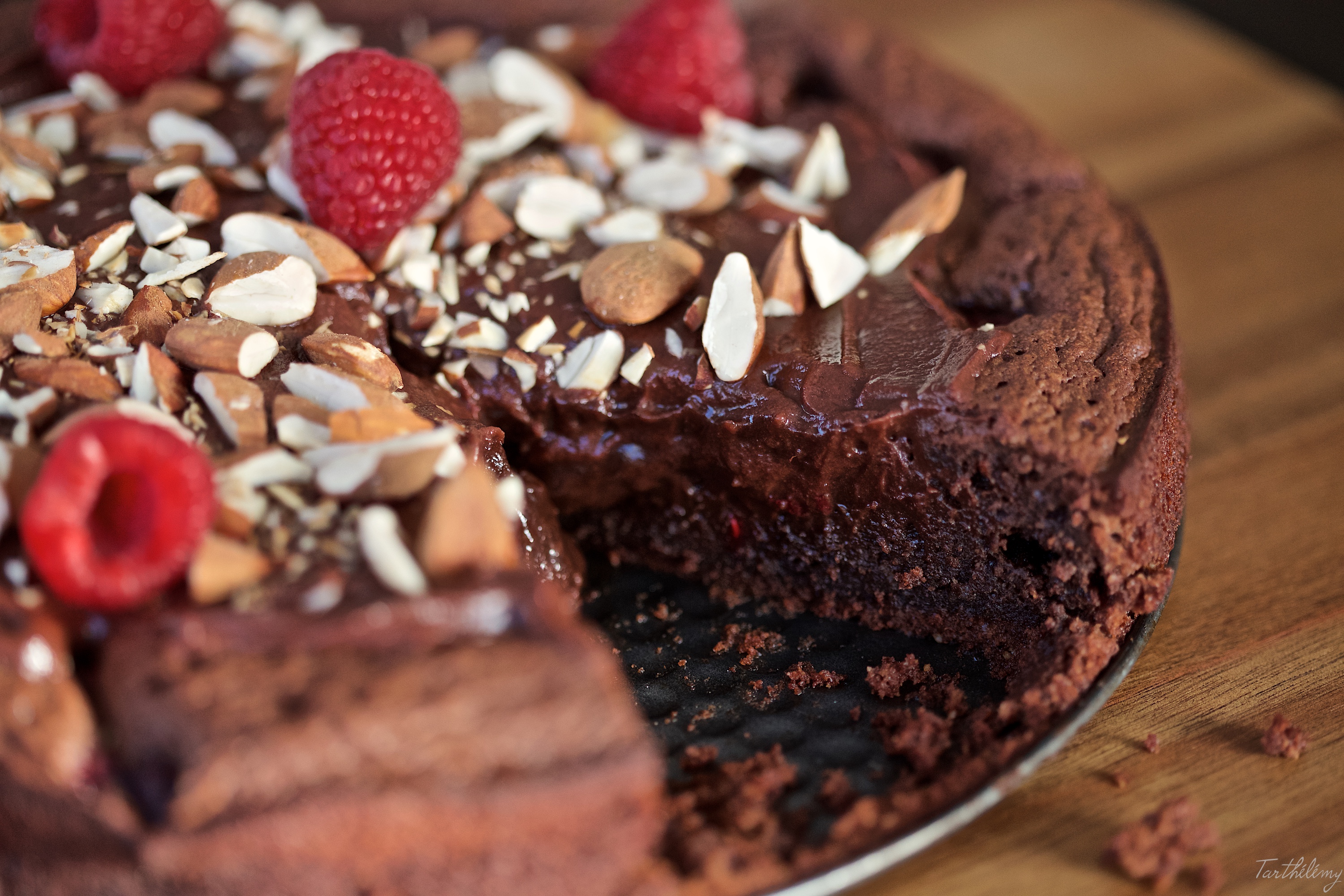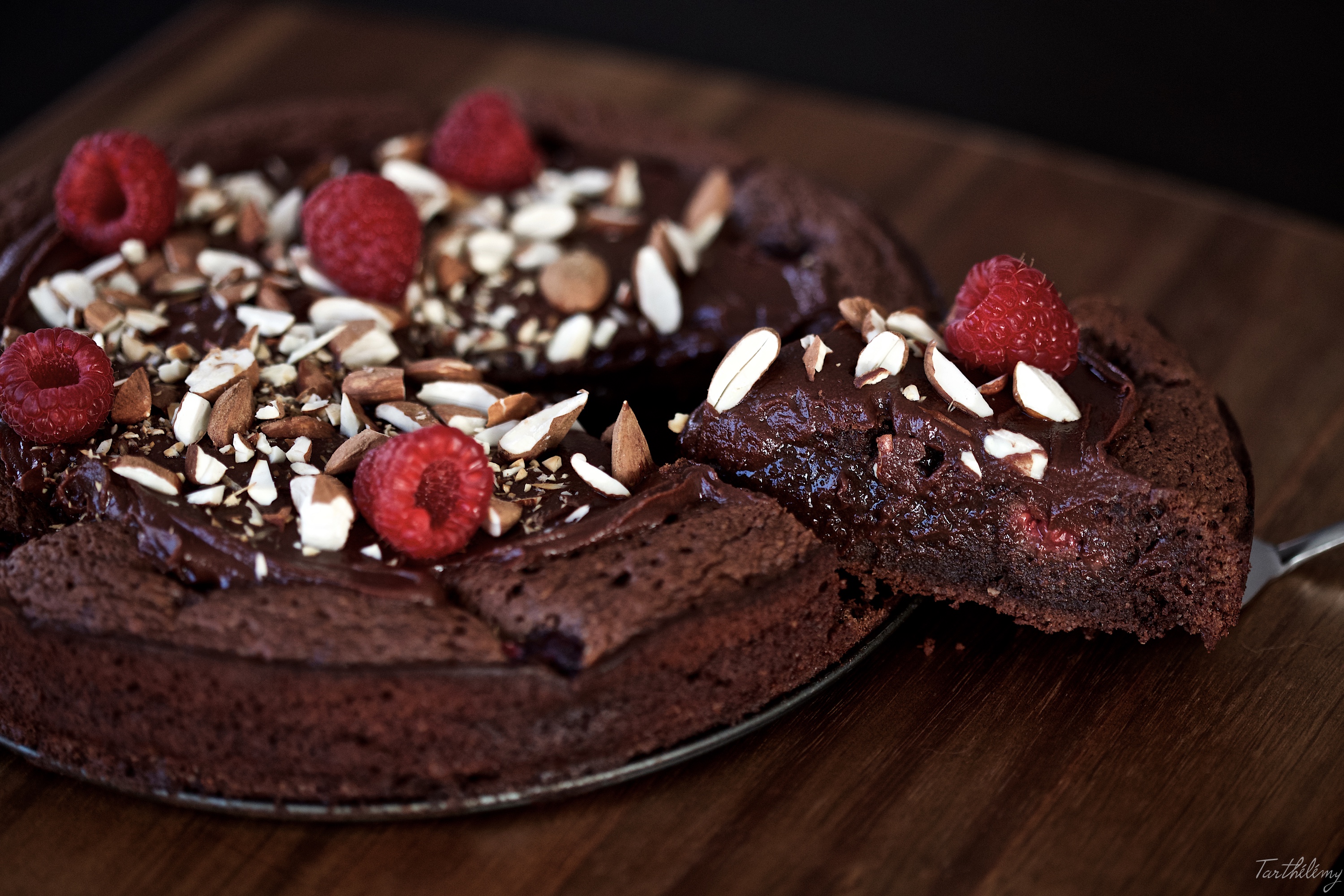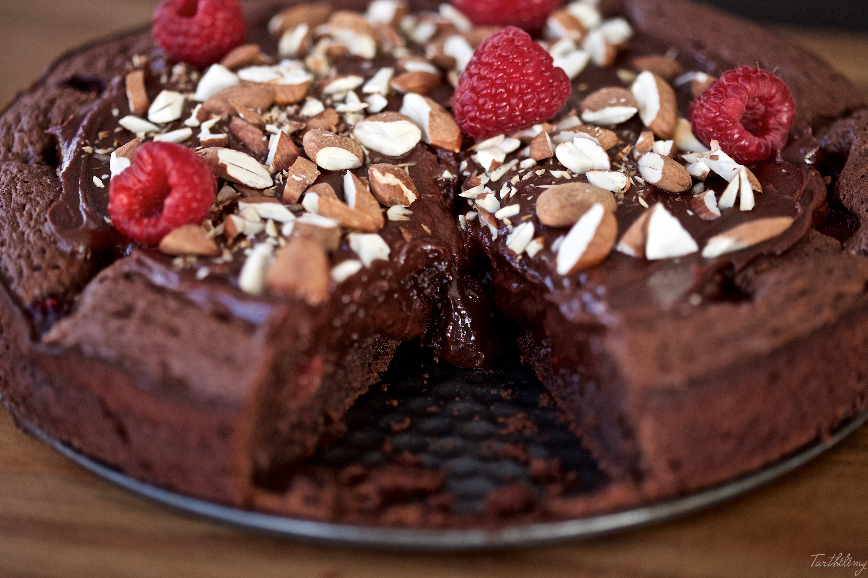 J’ai légèrement modifié la recette originale, en remplaçant les noisettes par des amandes, et en ajoutant des framboises. J’ai aussi fait une recette différente pour la ganache au chocolat qui recouvre le gâteau. Je vous assure que le résultat est fantastique!