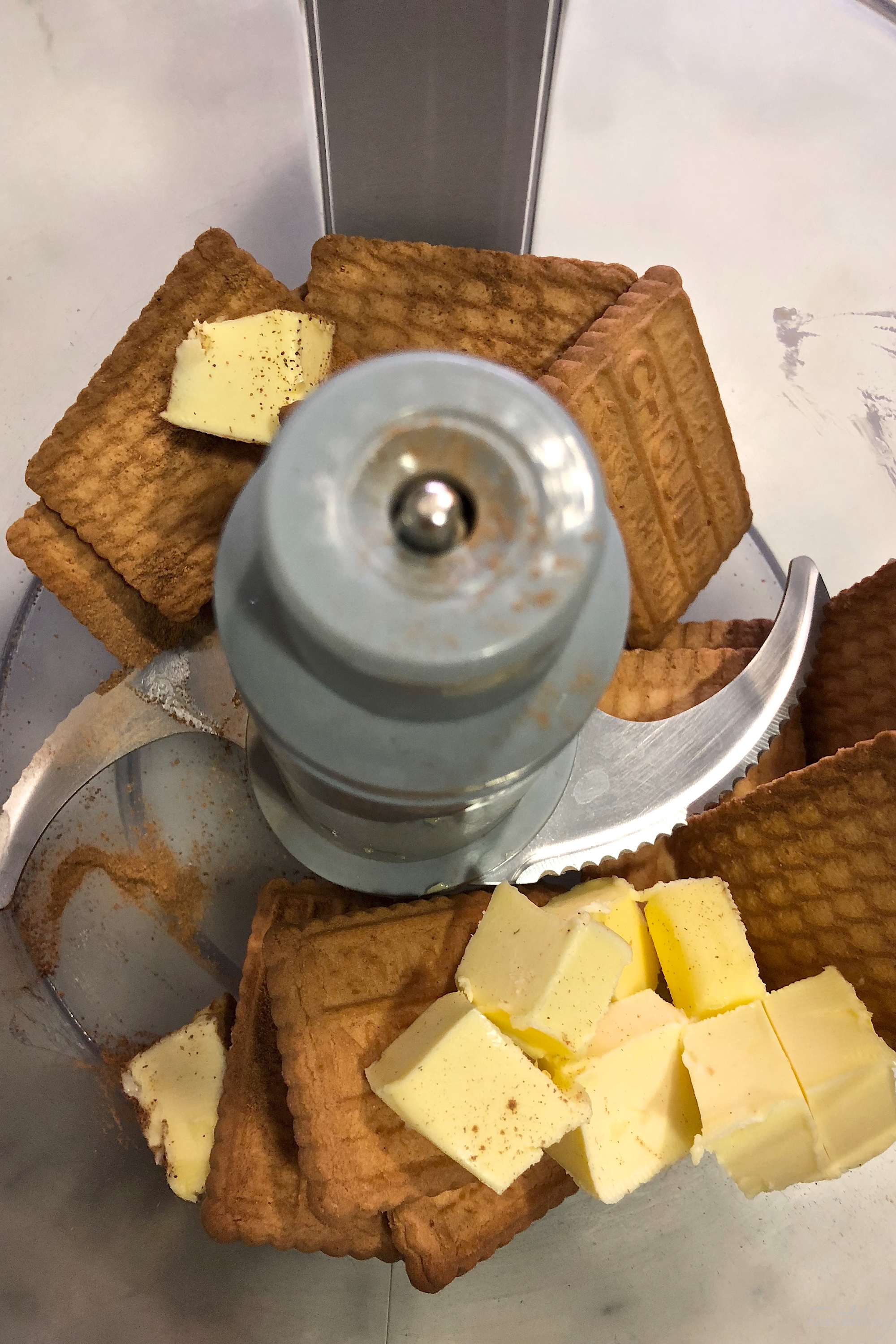 Préparez d’abord la base: mixez les biscuits avec le beurre, le sel et la cannelle. Verser dans le moule amovible et presser bien au fond et sur les bords pour avoir une base compacte. Réserver au frais.