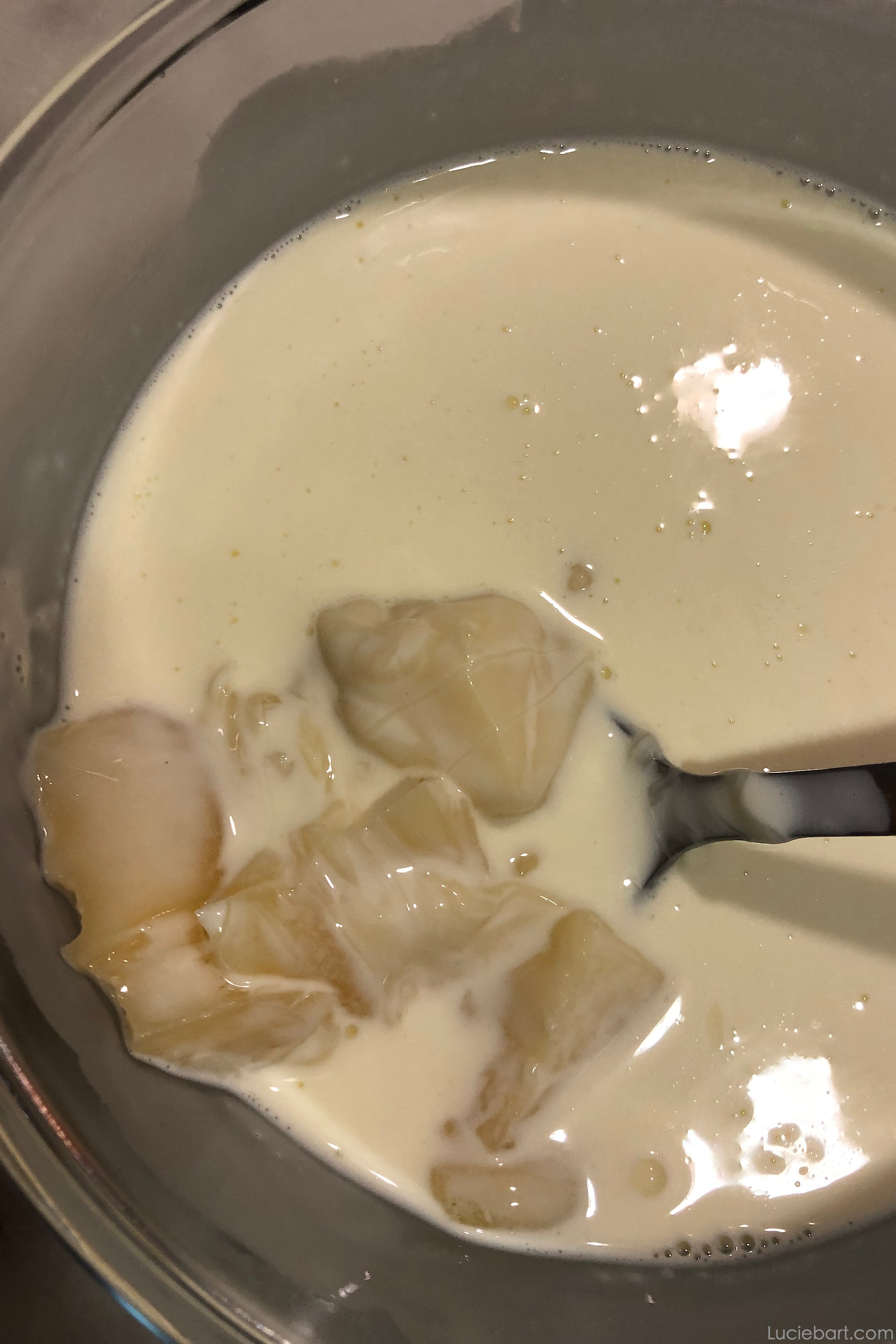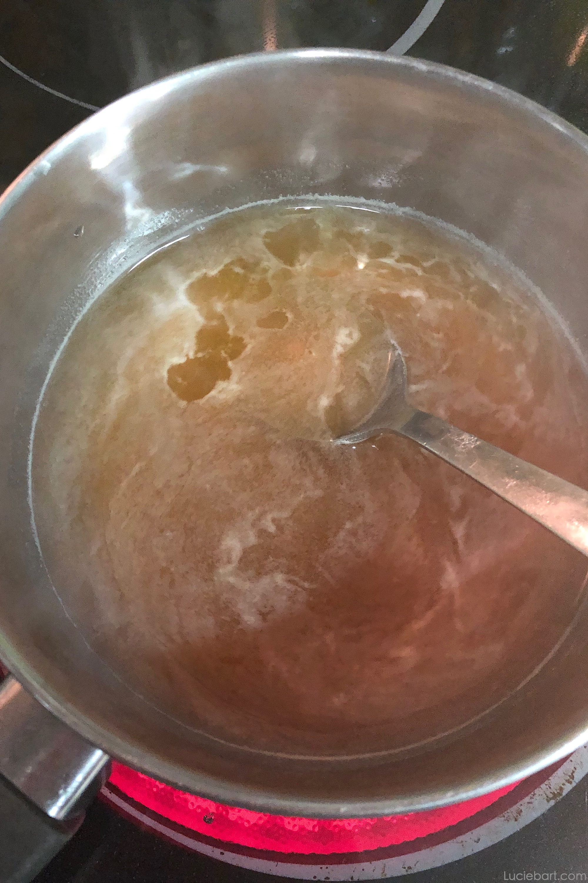 Preparar el sirope. Calentar la miel, el agua y el extracto de vainilla hasta que llegue a hervir.