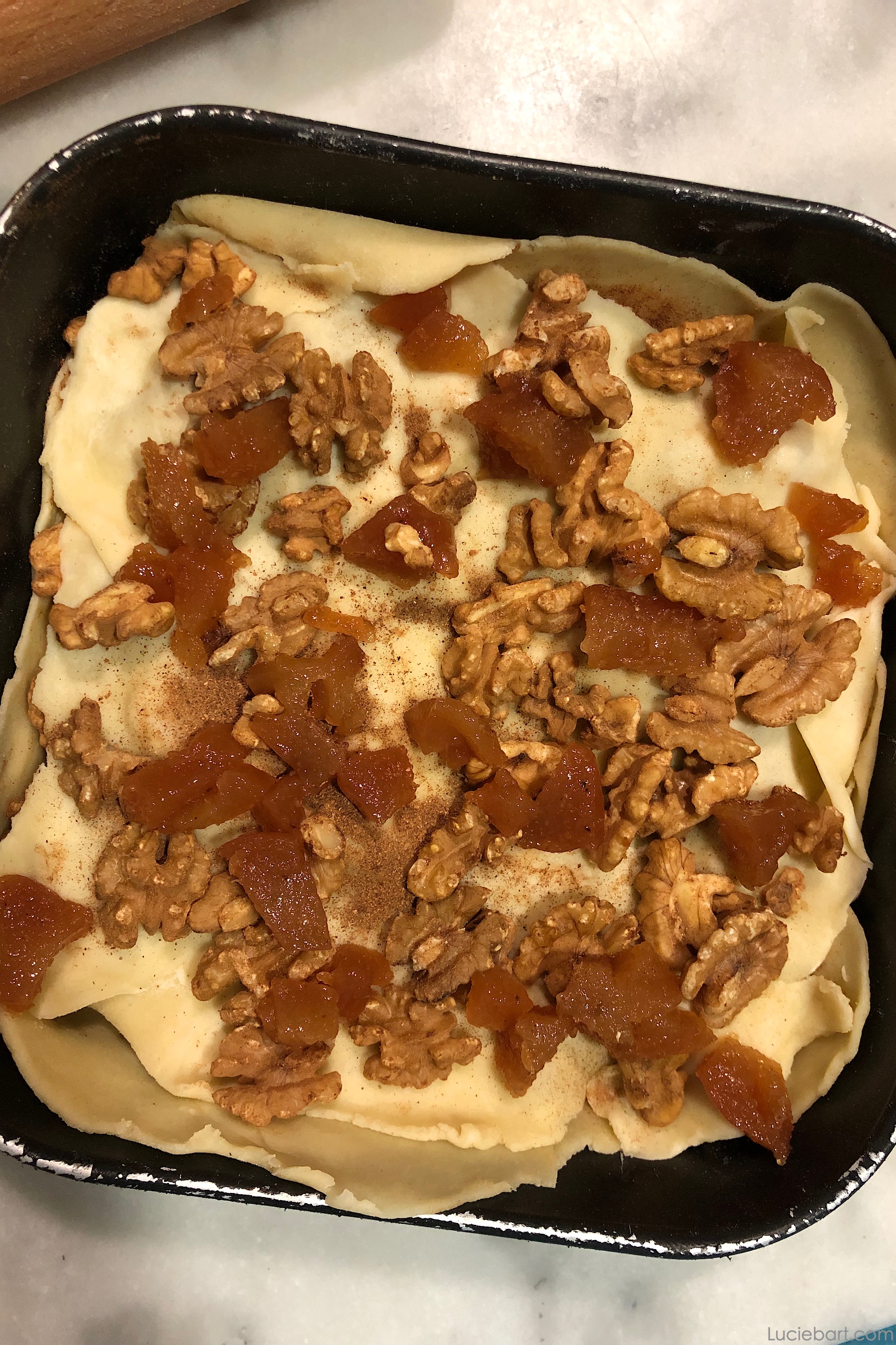 Verter la mitad del relleno de nueces y del dulce de membrillo sobre las tres capas de masa y cubrir con una capa de masa.