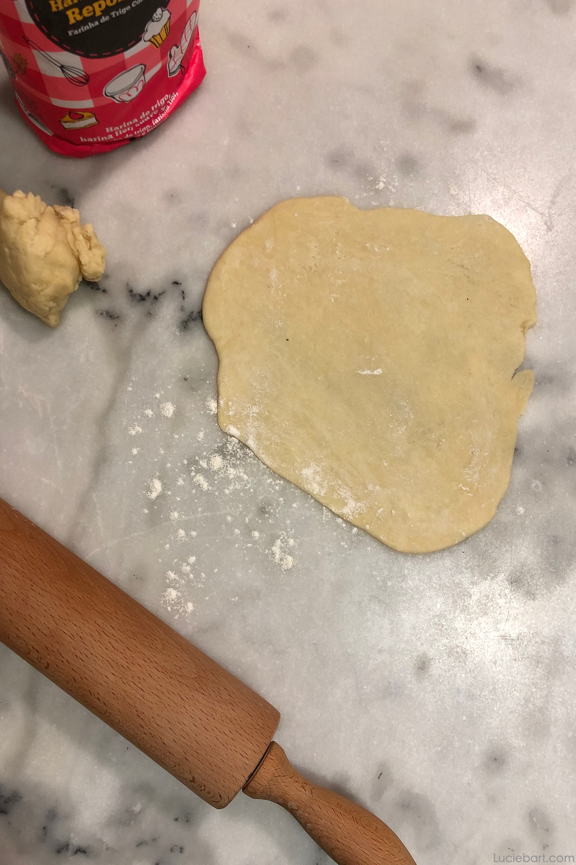 Estirar cada porción de masa con la ayuda de un rodillo y sobre el plan de trabajo enharinado, hasta formar cuadrados de algo más de 20 cm de lado.