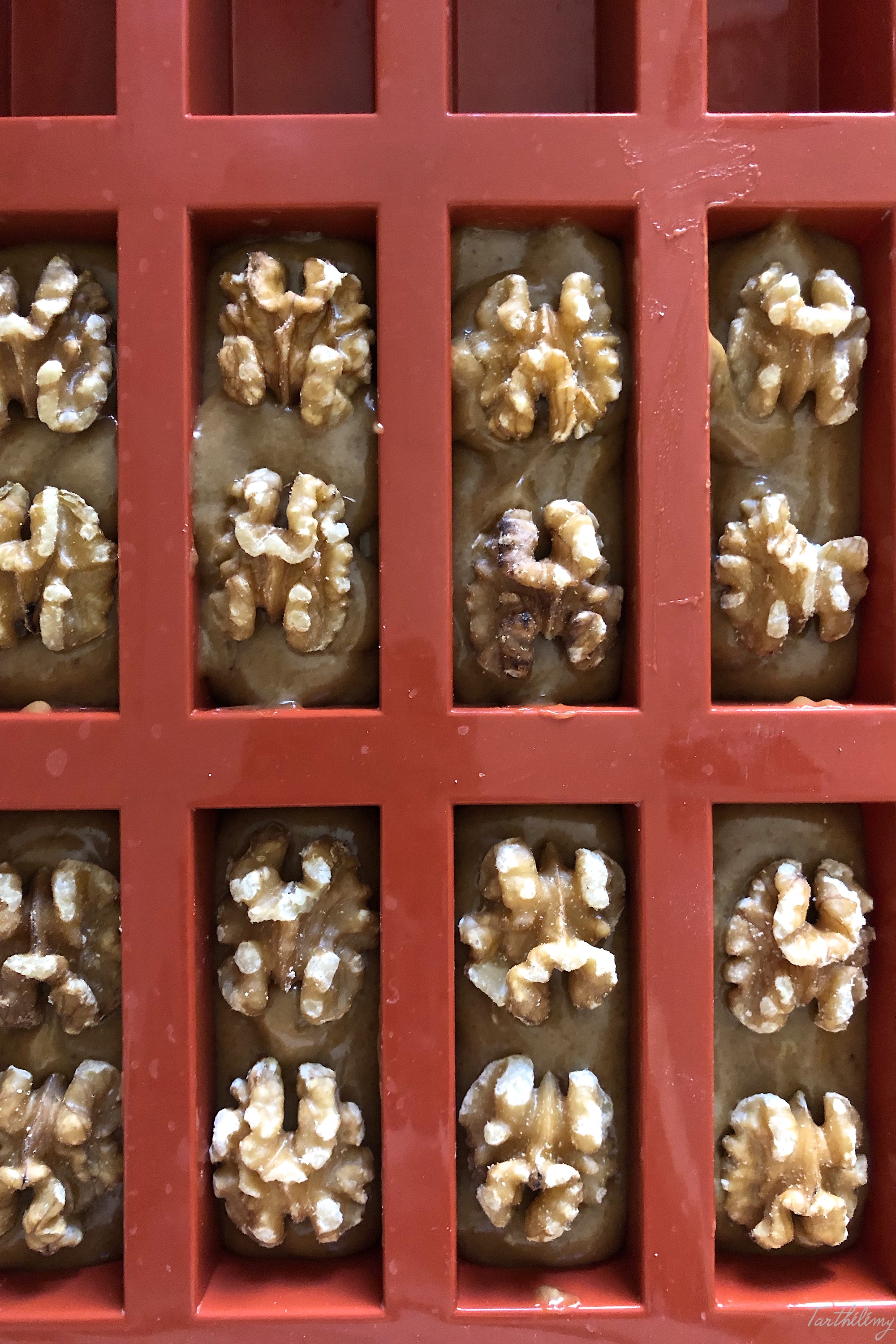 Para facilitar el relleno de los moldes, verter la masa en una manga pastelera. Decorar con las nueces y hornear durante 15 minutos.