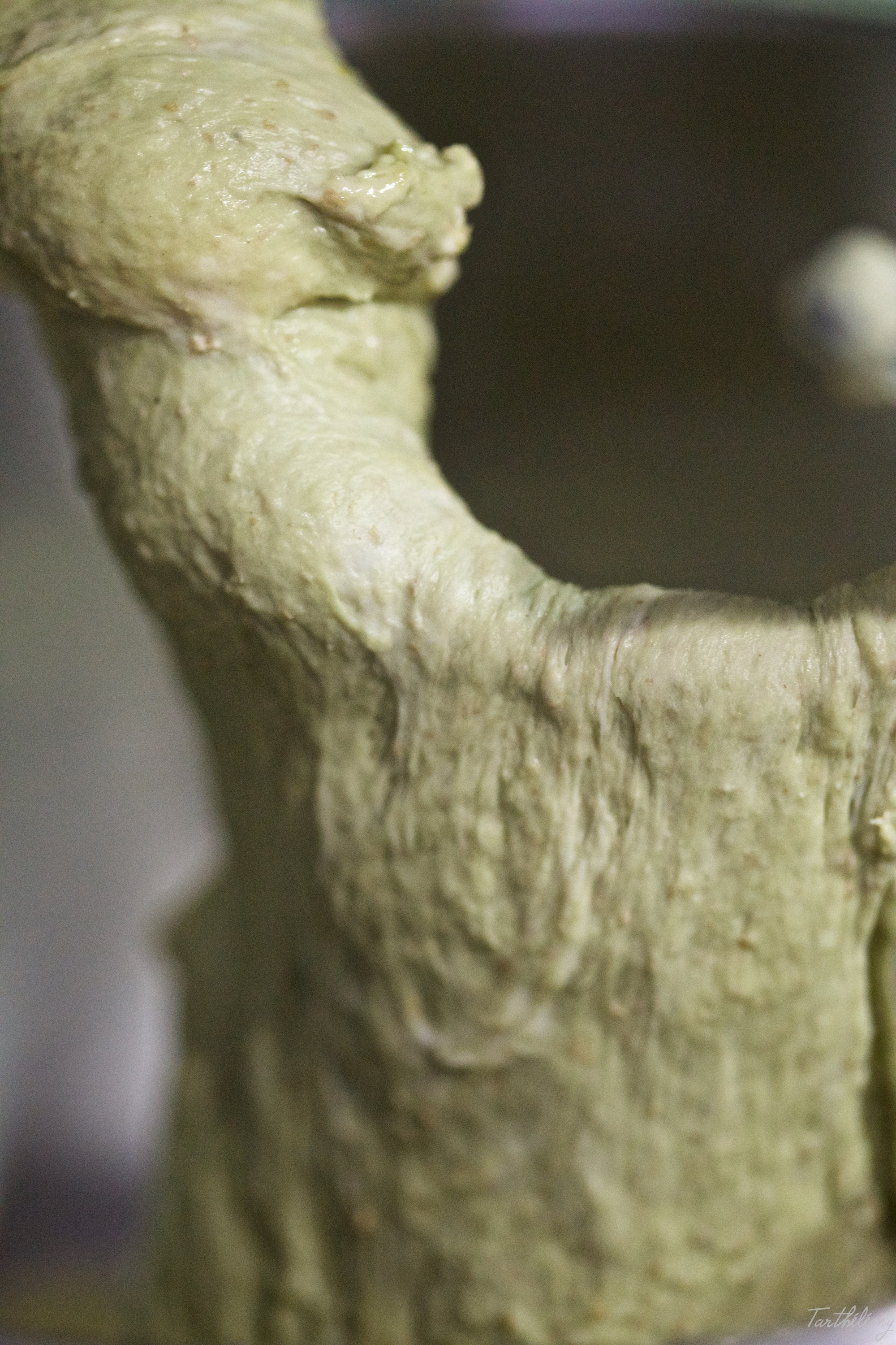Añadir el aceite y volver a amasar 2 minutos a alta velocidad. Luego añadir el té matcha y el agua de azahar, y amasar a baja velocidad hasta que la masa esté verde y homogénea.